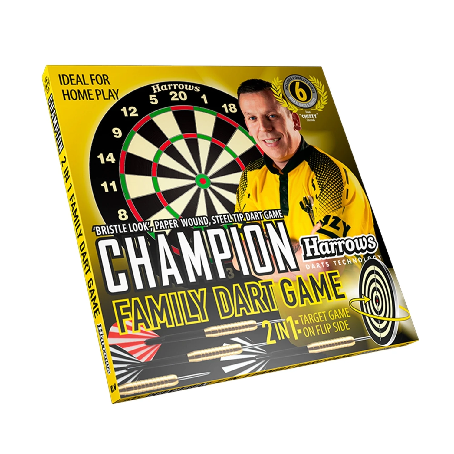 Experience the game of champions with the Harrows Darts ‘Champions Family Dart Game’. Endorsed by PDC Champion, Dave “Chizzy” Chisnall, it’s perfect for family fun. This tournament sized (18 x 1″) paper coil steeltip game includes six 18g brass darts.