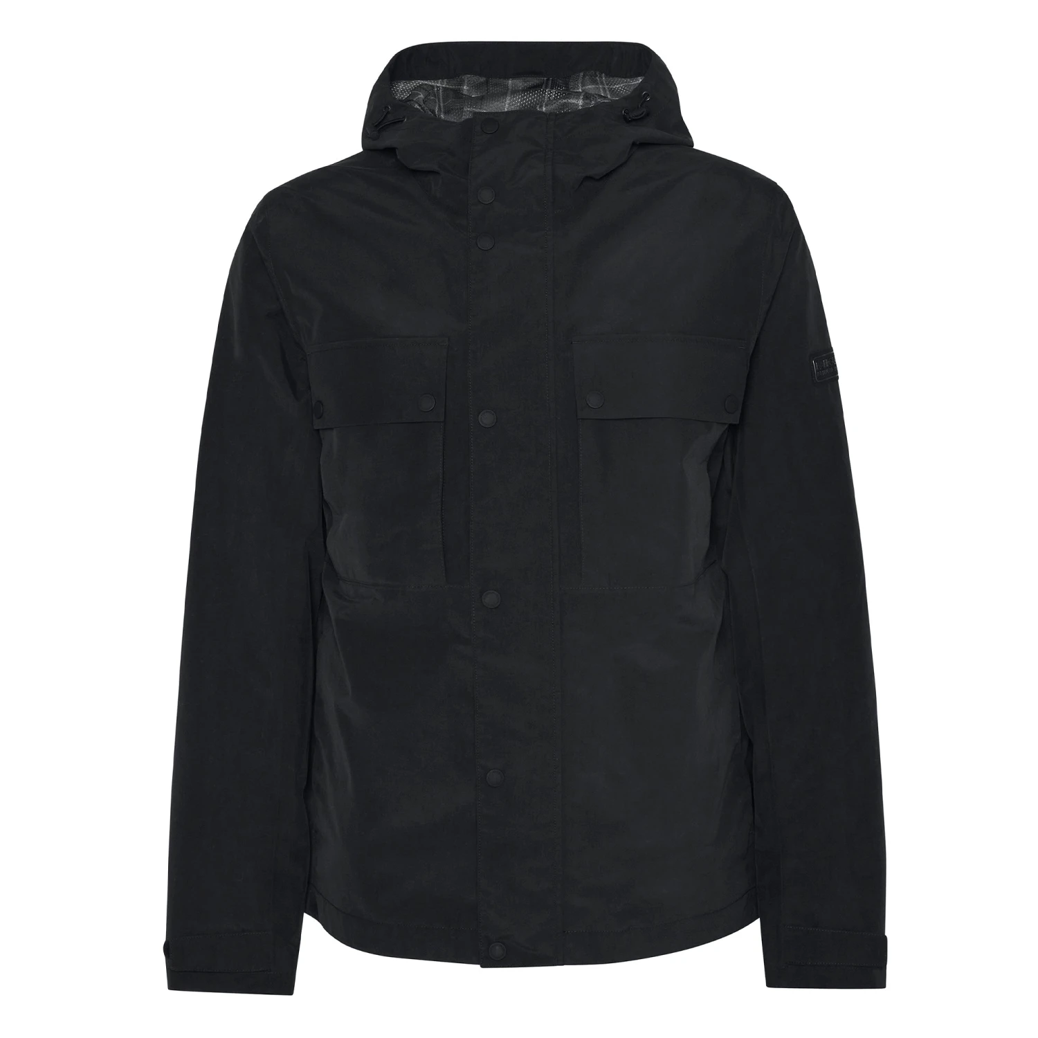 Hooded waterproof with mesh tartan lining and two chest pockets with studded pocket