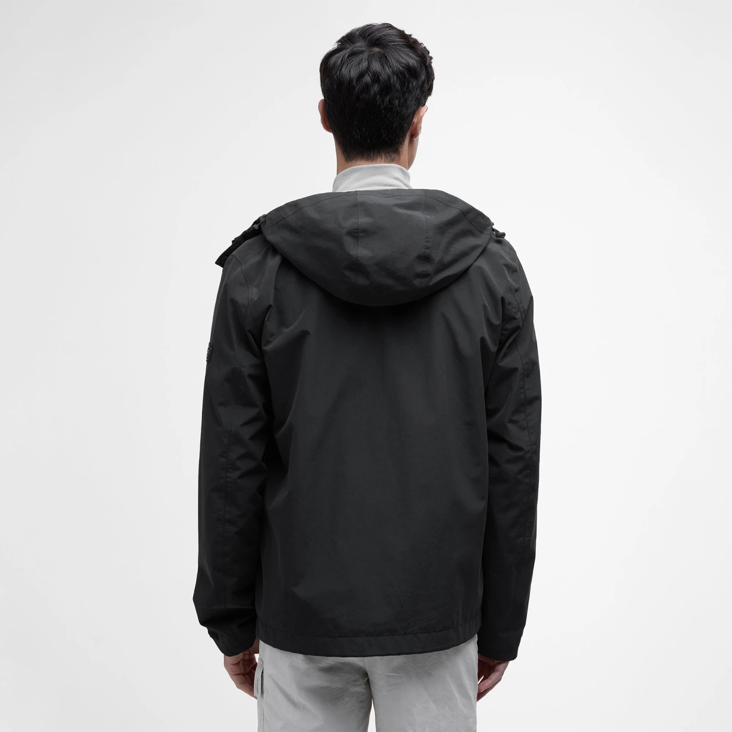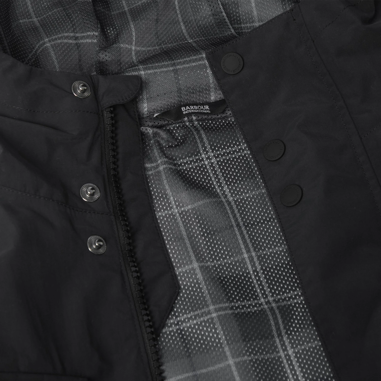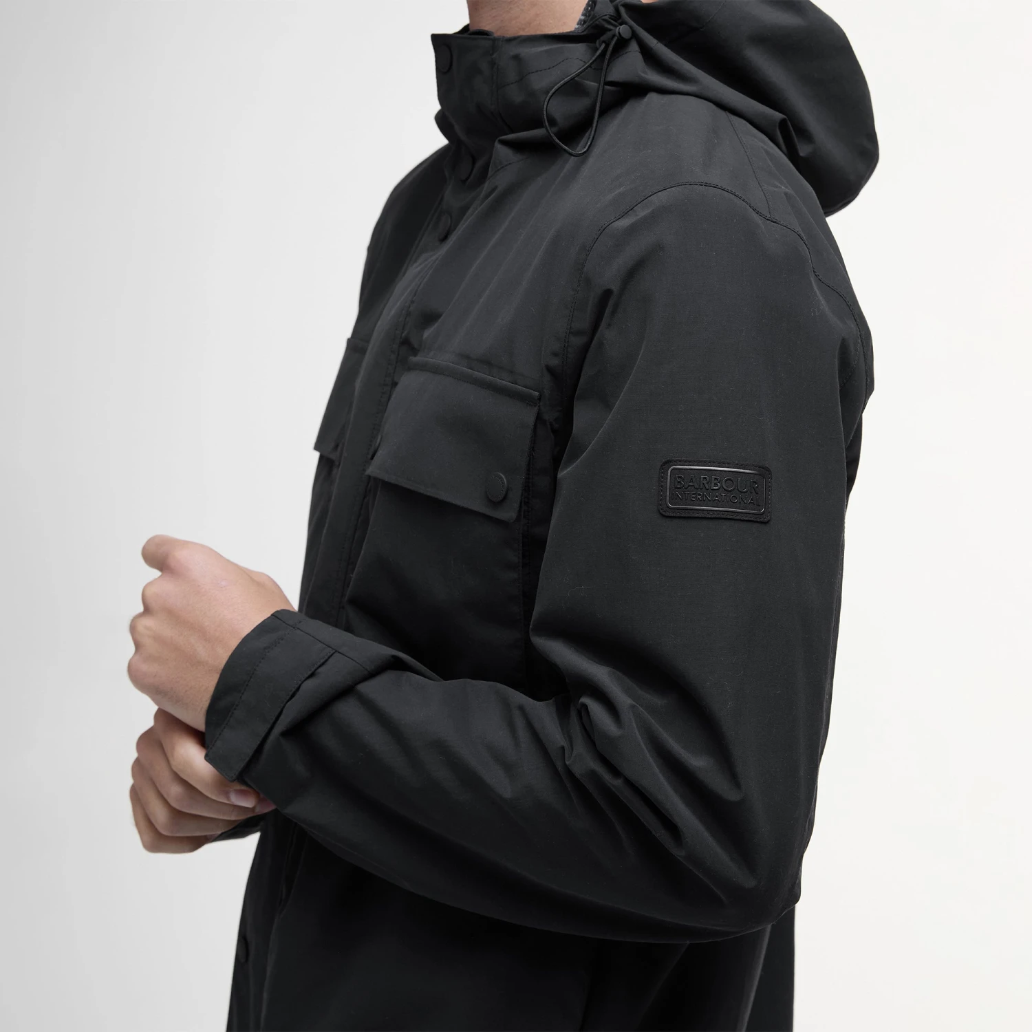 - Barbour International black and gun metal embossed badge to left sleeve.