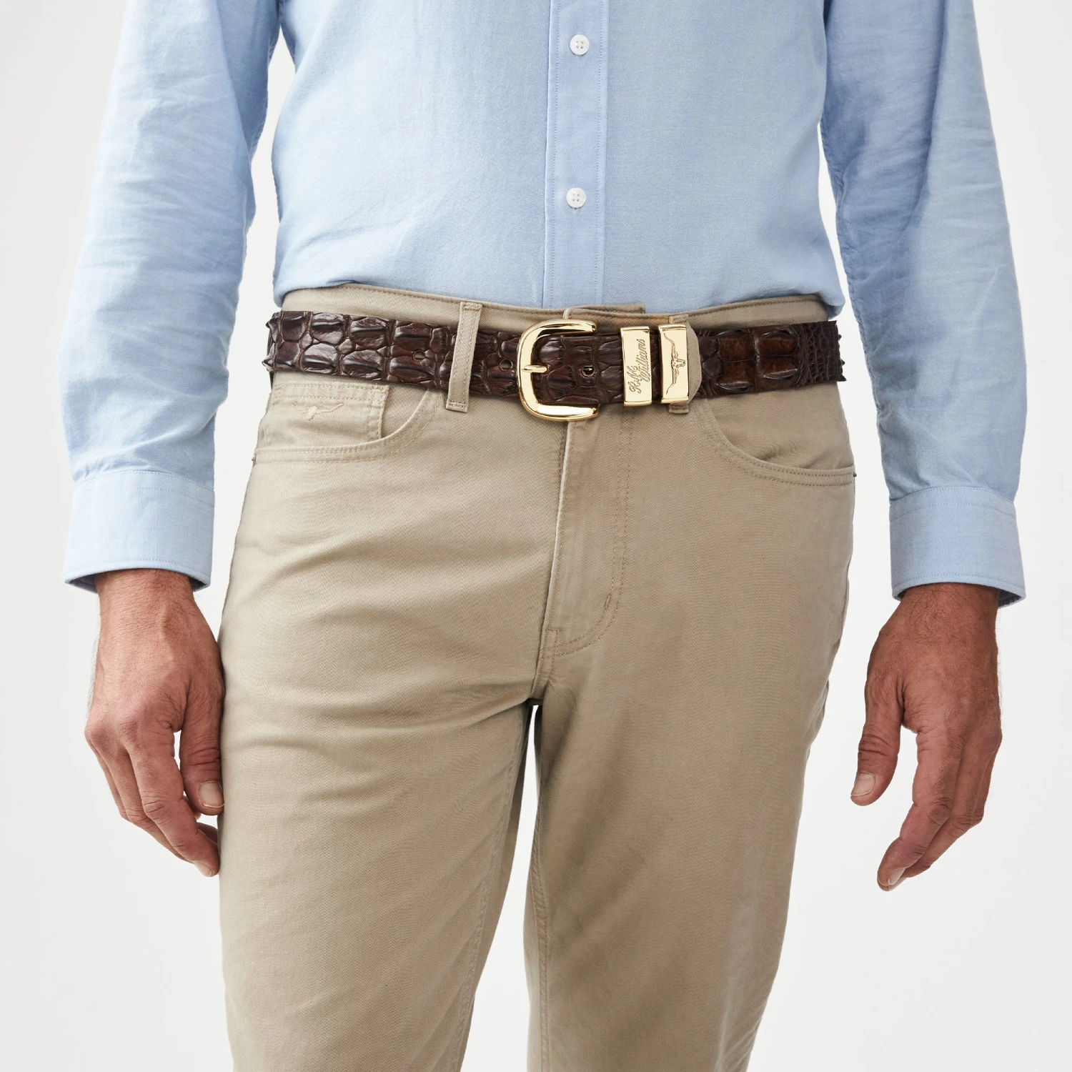 The 1 1/2″ wide Crocodile belt is masterfully crafted from premium Australian saltwater crocodile leather in the RM Williams Adelaide workshop. This timeless design features a high-polish buckle and double keepers with debossed logo and Longhorn detailing.