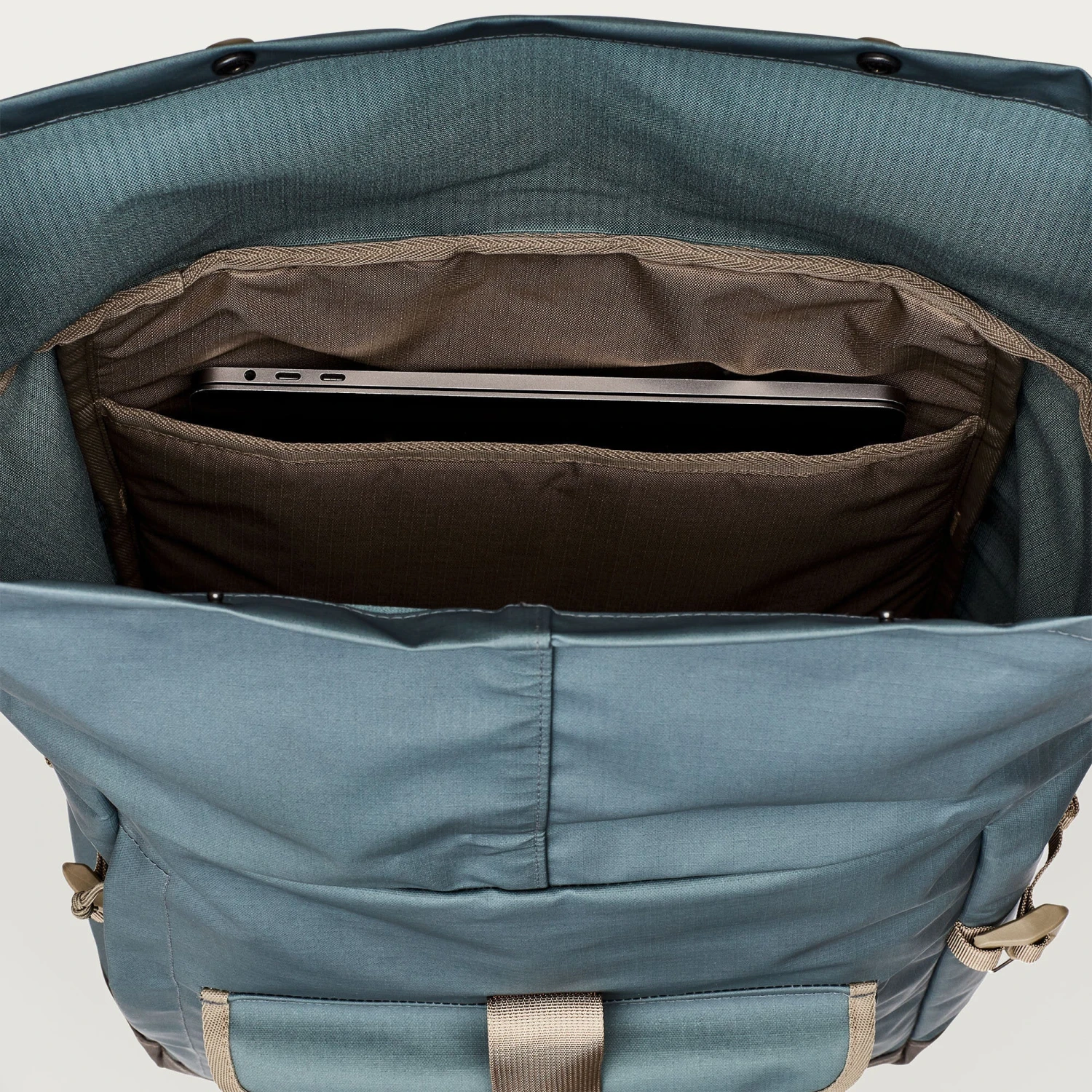 The buckling roll-top design is a time-tested closure that prevents water entry and provides easy access to the main compartment. This water-resistant pack features an interior laptop pocket and compression straps on each side to stabilize varying load sizes.