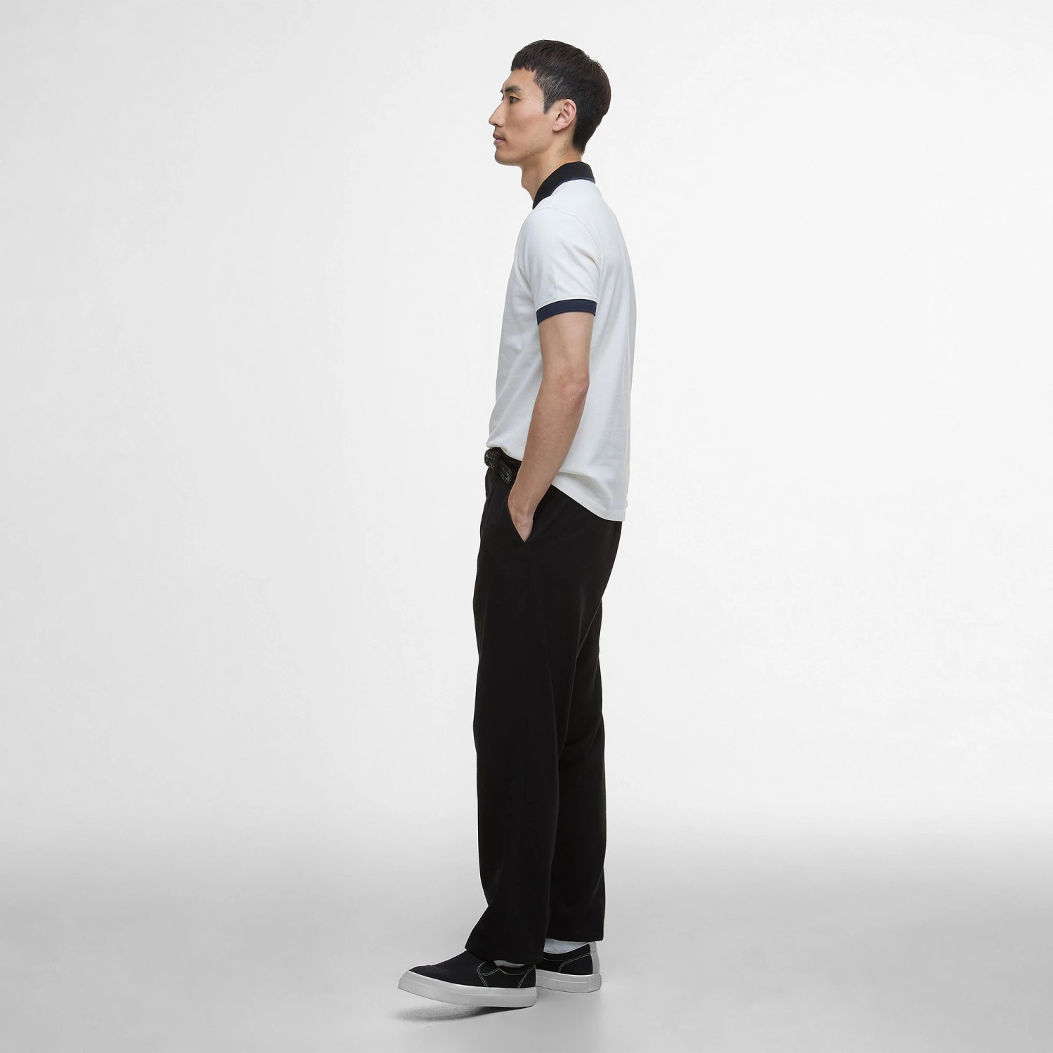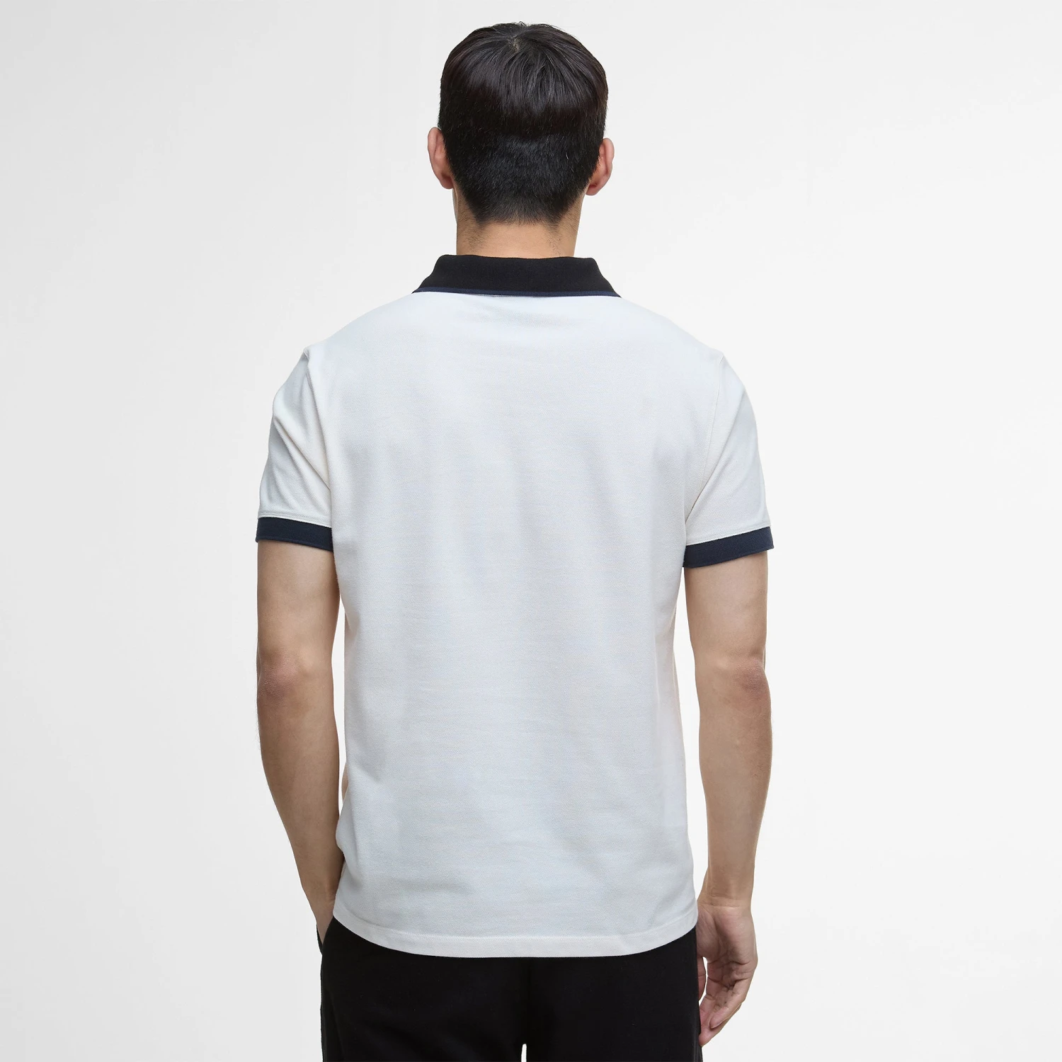 Short sleeved cotton pique polo with tipped contrasting and 1×1 flat knit collar and cuffs.