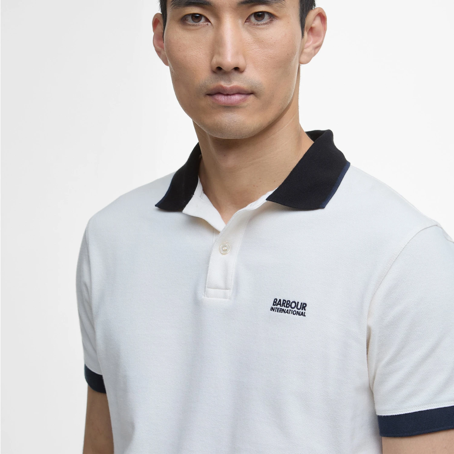 - Barbour International contrast branding to left chest.