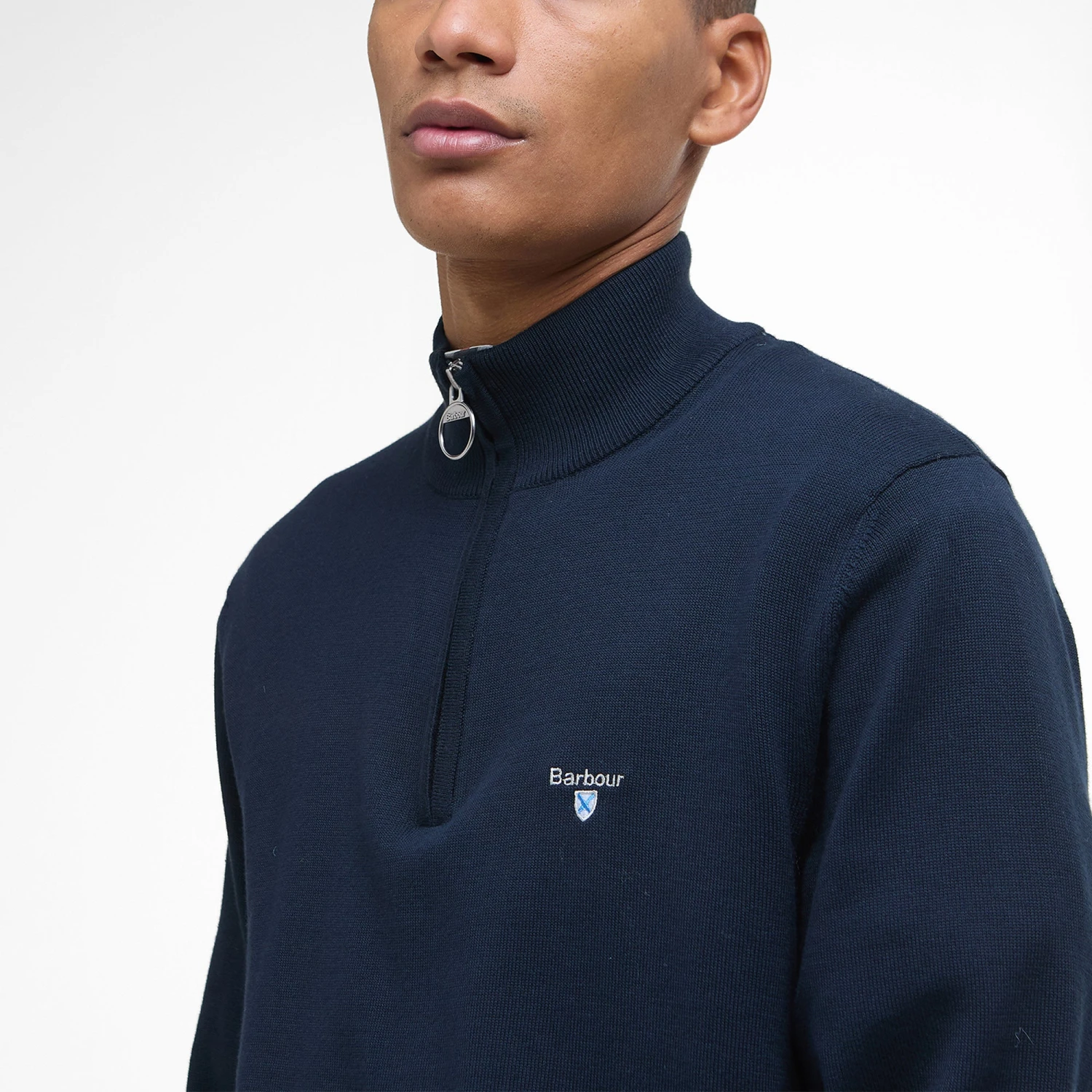 Barbour half zip knit in compact cotton, with rib to cuffs and hem. Finished with racking stitch detail to inner collar.