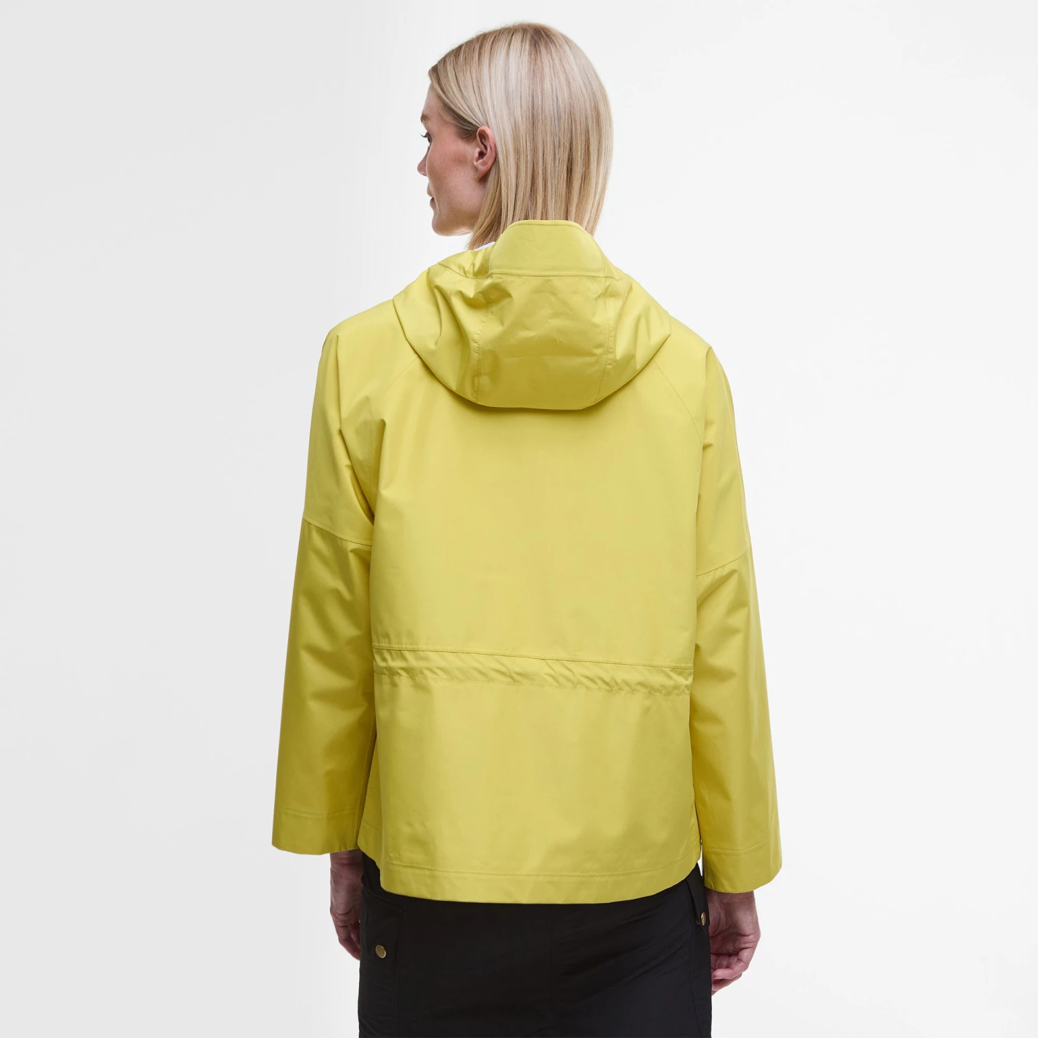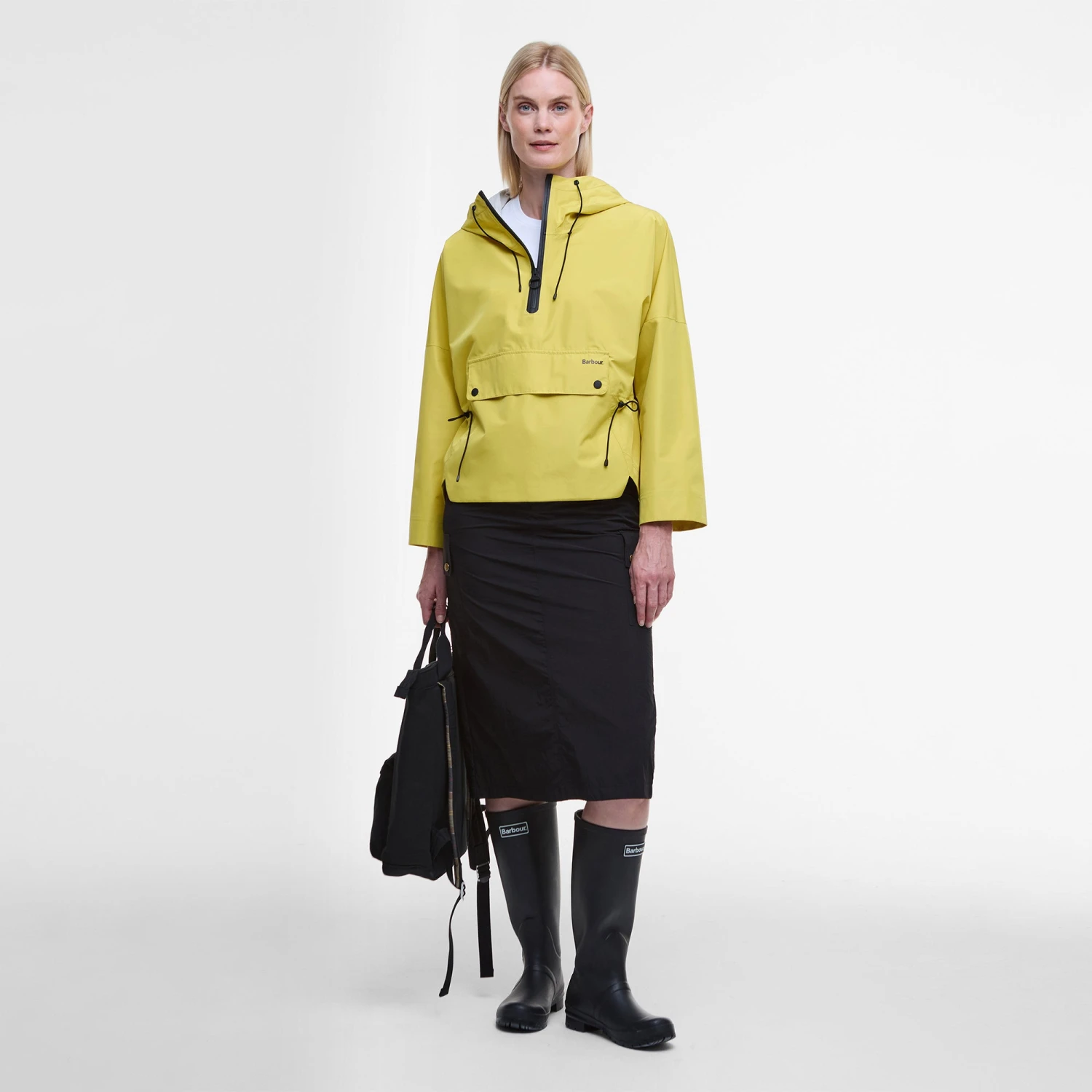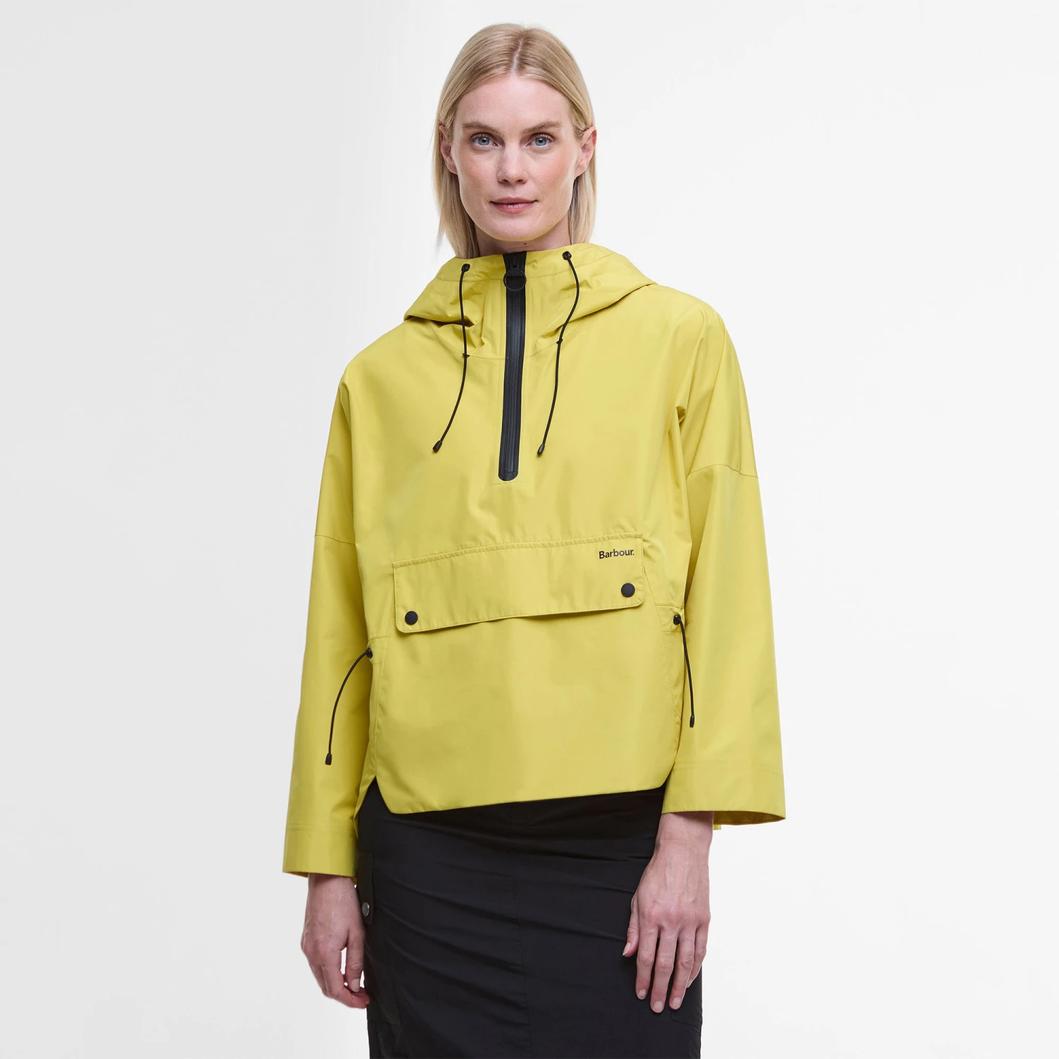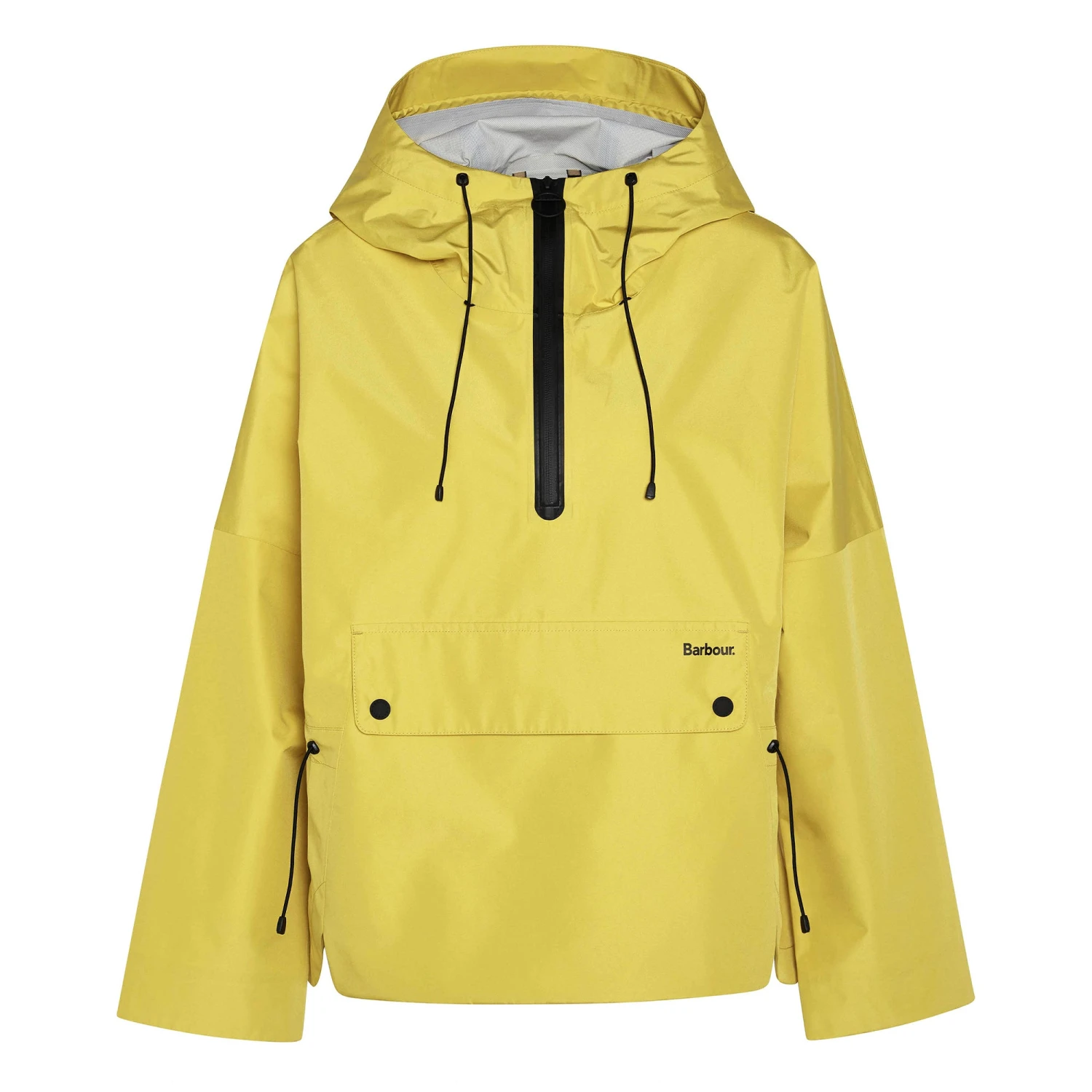 Smock style waterproof with large kangaroo pocket, drawcord waist detail and contrast black trims.