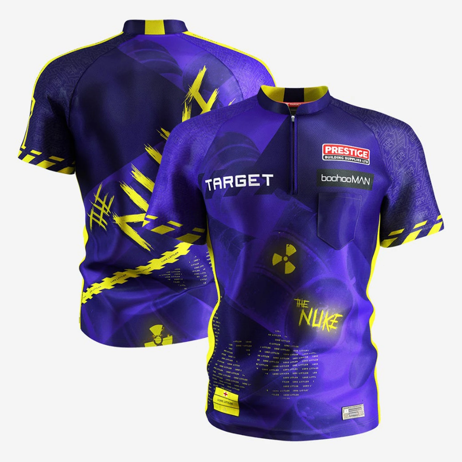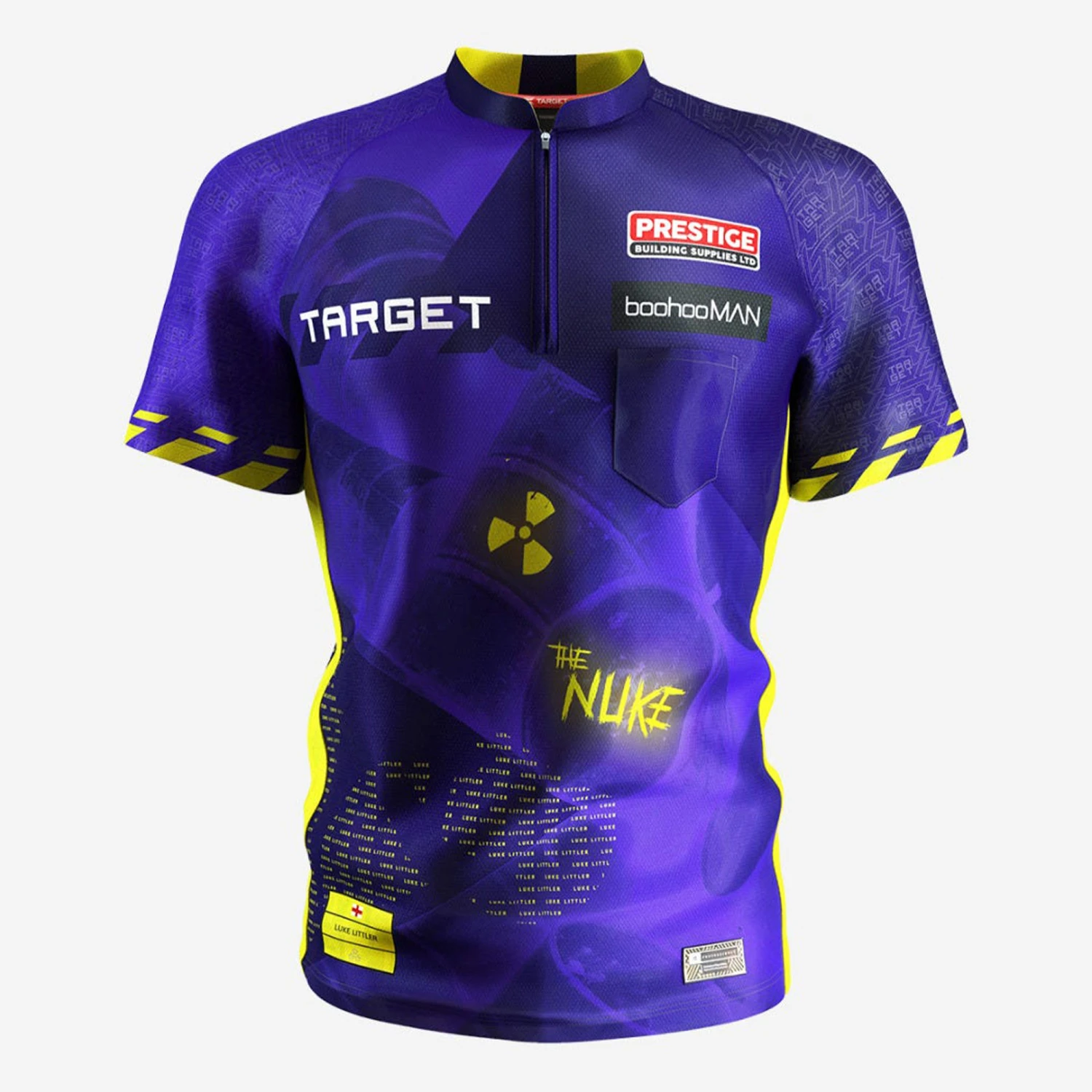 The shirt displays bold nuclear-themed graphics, including radioactive symbols and nuclear barrels. Neon yellow highlights adorn the sleeves and sides, while “The Nuke” is prominently displayed across the shirt’s signature purple design, making it as explosive as Luke’s talent on the oche.