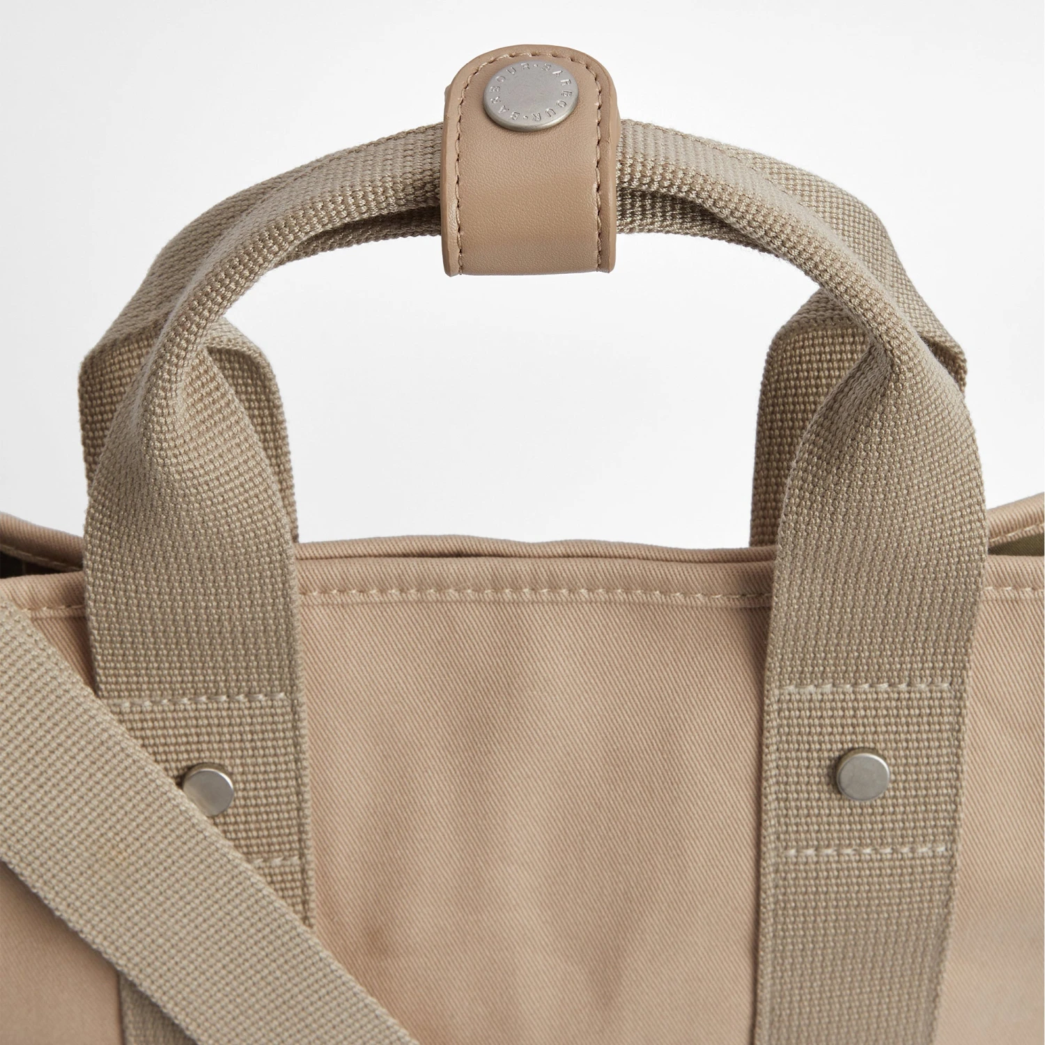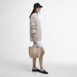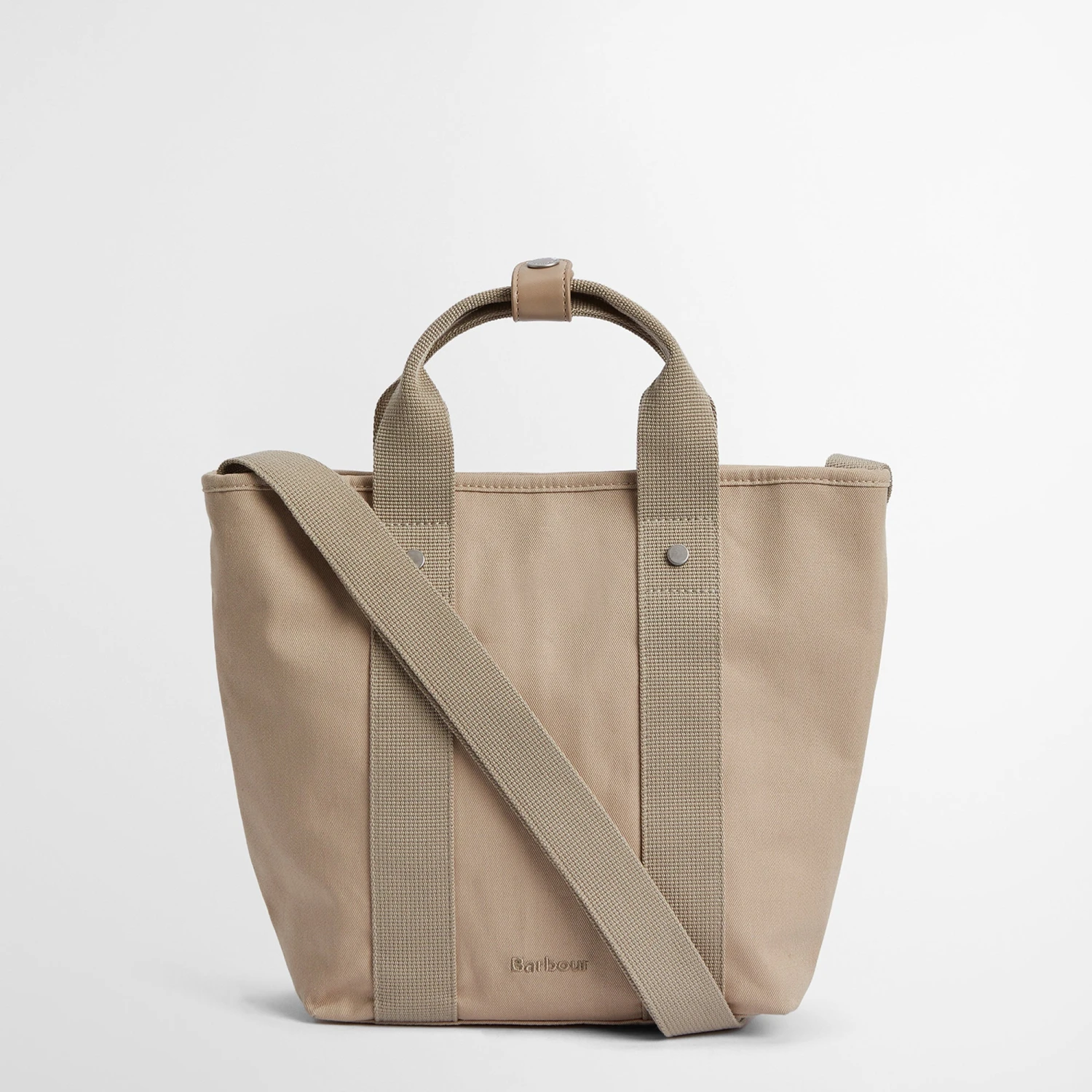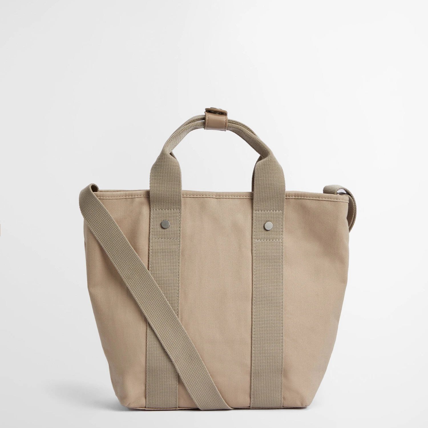 Zip fastening cotton drill tote style bag with detachable webbing shoulder strap and grab handles. Featuring brushed silver effect hardware and inner zipped pocket.