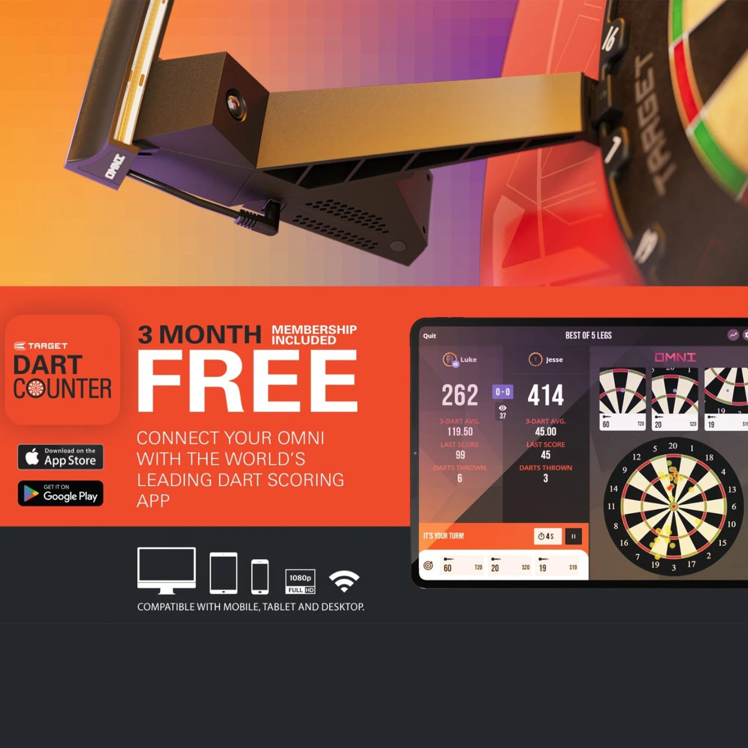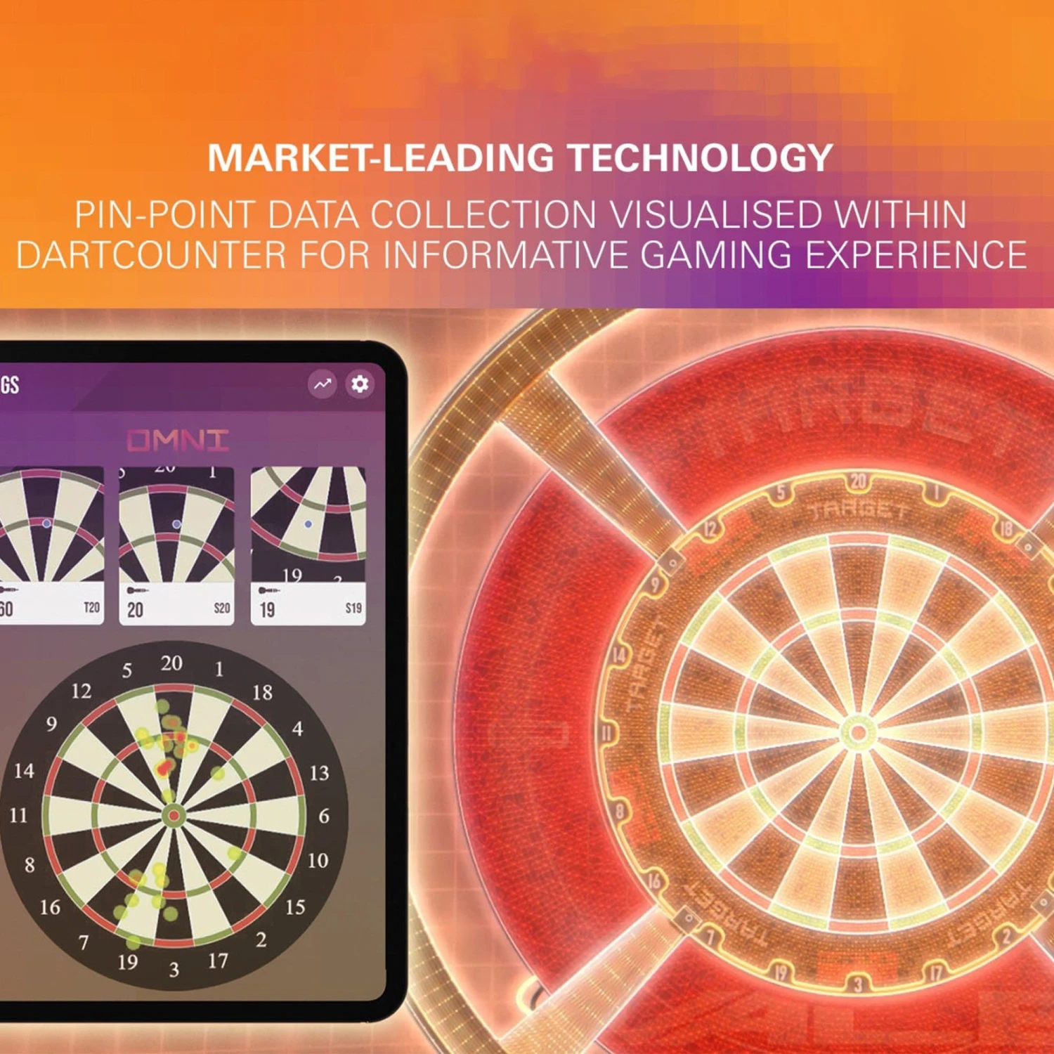 Experience fast auto-scoring, detailed tracking, and the future of darts with Omni by Target Darts. Elevate your game, captivate your audience, and enjoy a complimentary 3-month trial of the DartCounter App to start your journey where every throw is a masterpiece.
