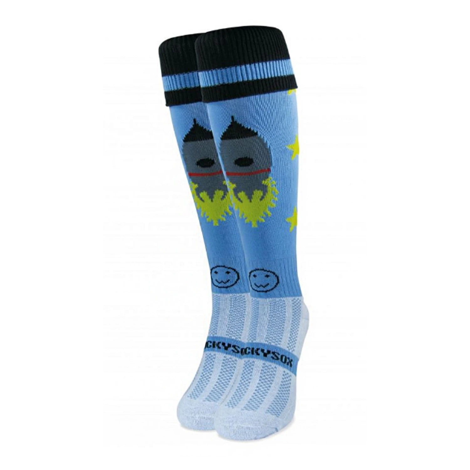 Pocket Rocket WackySox are sky blue knee length socks with a single large image of a space rocket in grey, black and yellow on the front of the shin and small yellow stars to the side of each leg. The words POCKET ROCKET are written in black on the back of each leg. There are sky blue and black hoops in the turnover top and a black Wacky face logo on the front of the ankle.