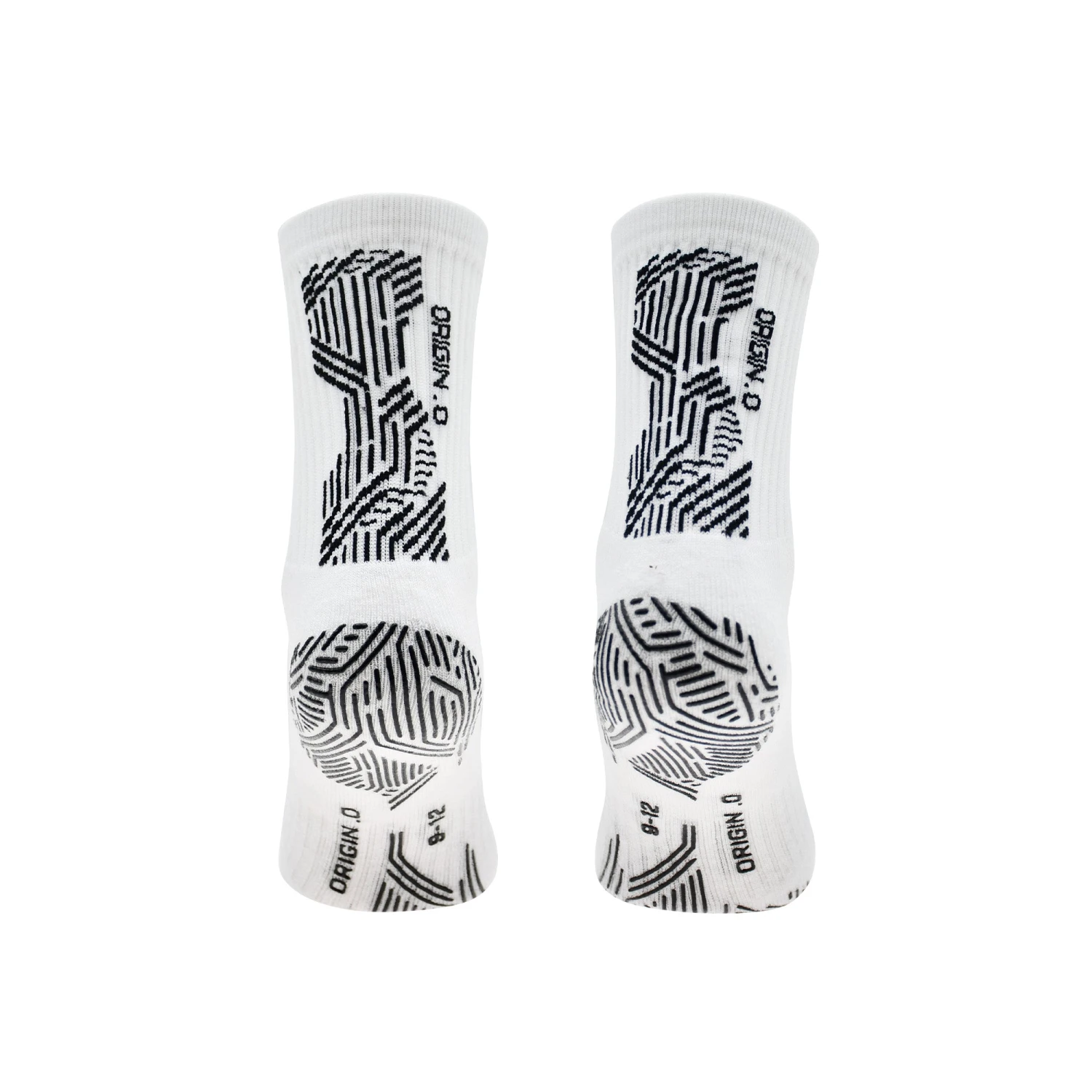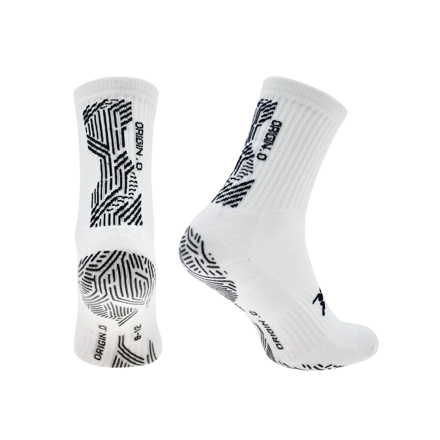 Gain the edge with white Precision Origin.0 Grip socks. Designed to grip your feet to the sole of your boots and trainers. The grip aids in acceleration, deceleration, change of direction in any sport. Superior silicone anti slip grip with dual grip inside of the sock to ‘lock in’ resistance for maximum gripping action. Origin.O are perfect football grip socks and can be used with our range of Precision football sock sleeves.Â