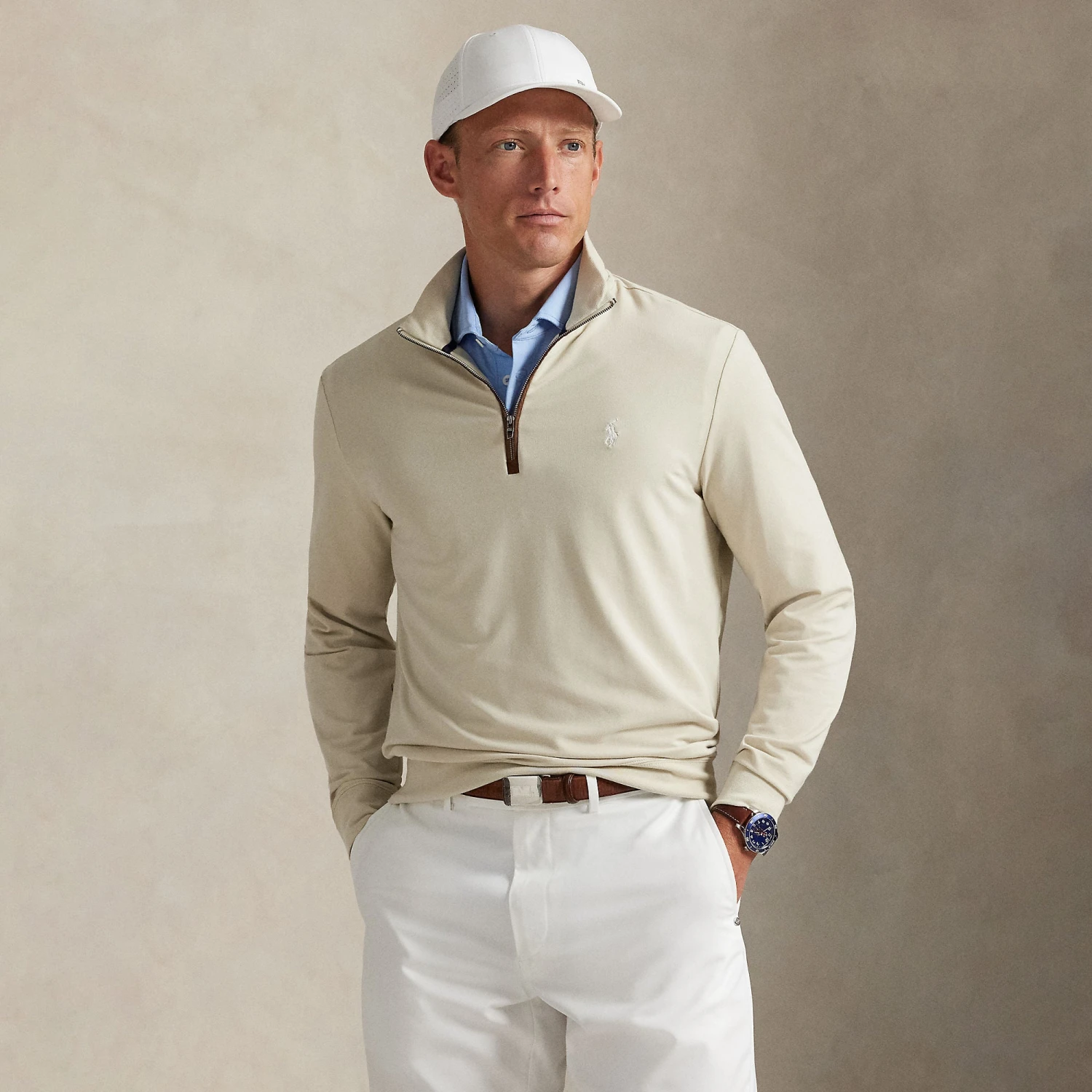 This pullover’s stretch French terry is made from a comfortable cotton blend and developed to repel water.
