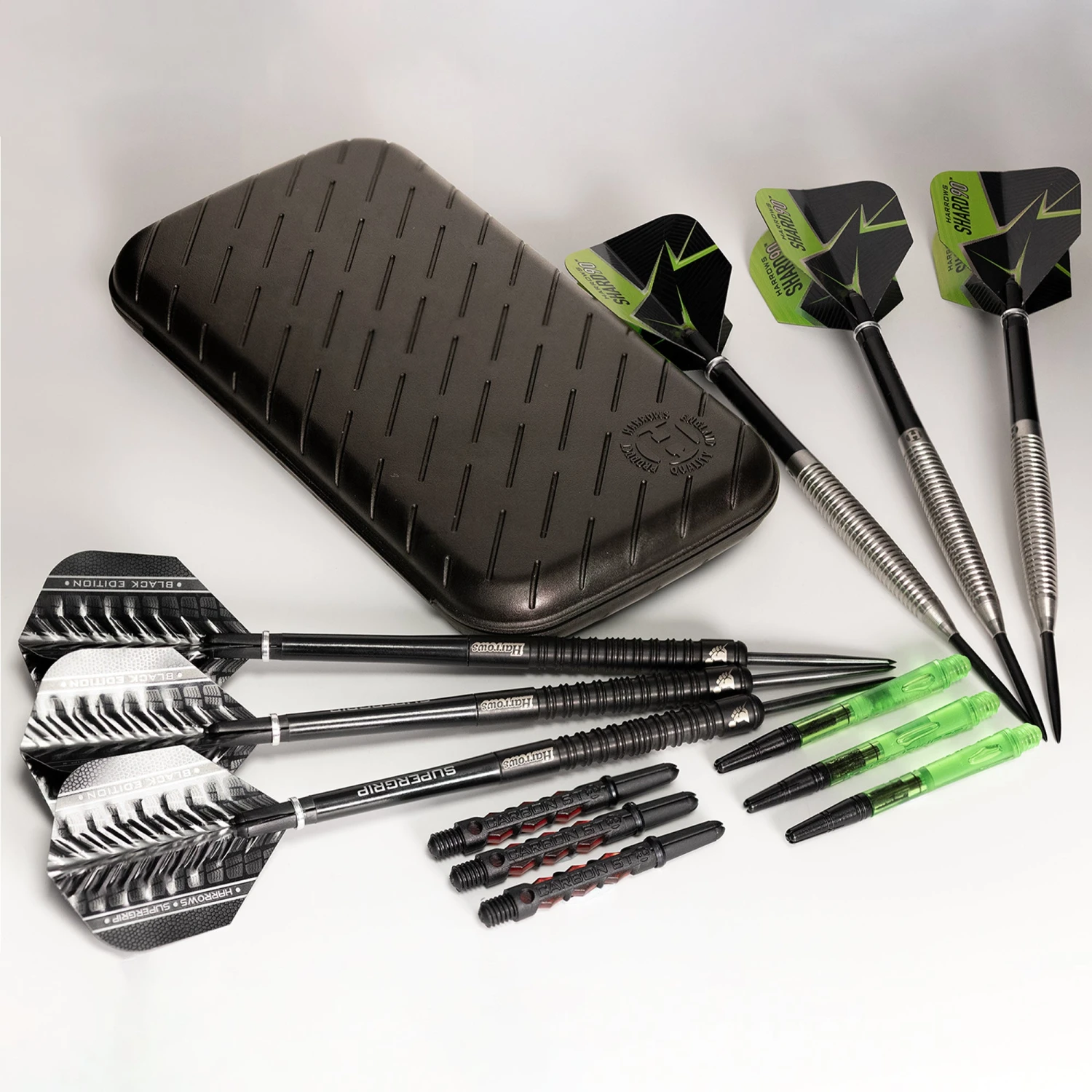 - Holds 6 darts fitted with shafts, 2 sets of extra shafts and 2 sets of flights