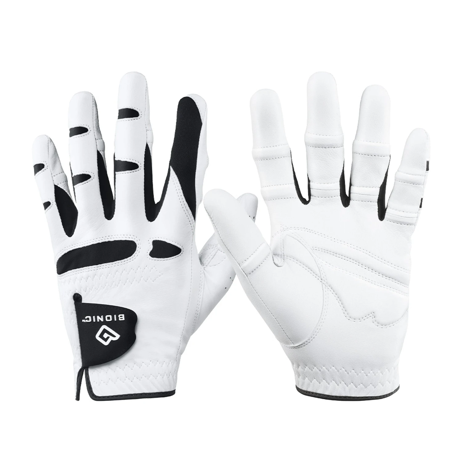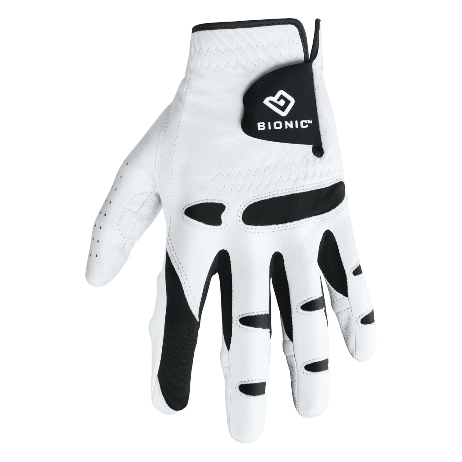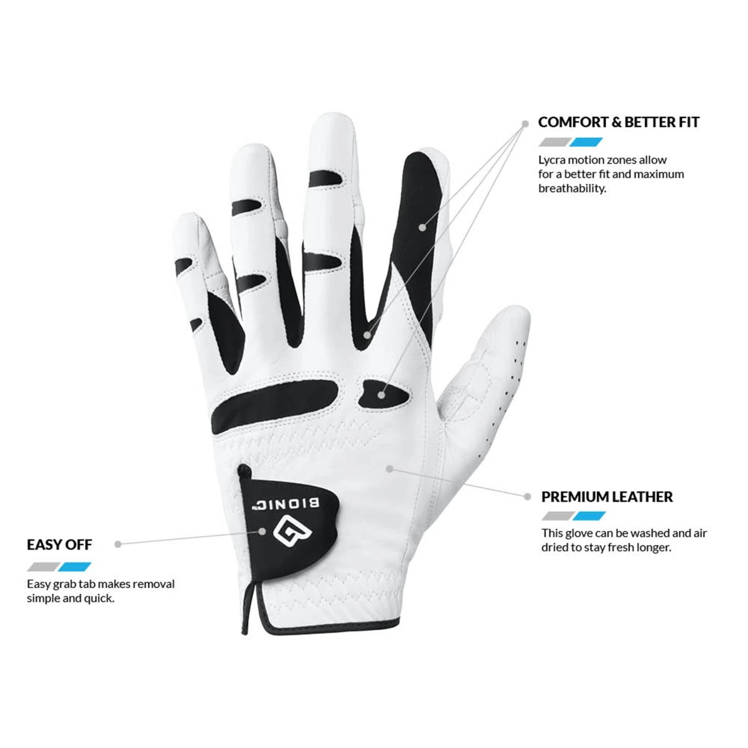 Get in the game! The StableGrip® golf gloves are designed with a hand specialist to help improve your grip and performance. Regardless of your experience level, your game will benefit from Bionic’s patented pad technology, which helps even out the surface of your hand, providing a better grip. The tapered, pre-rotated finger design conforms to the natural shape and contours of your hand, while terrycloth micro-pads absorb moisture, even on the hottest days. Lycra gussets and web zones eliminate uncomfortable bunching between the fingers, resulting in a more confident, effective shot.
