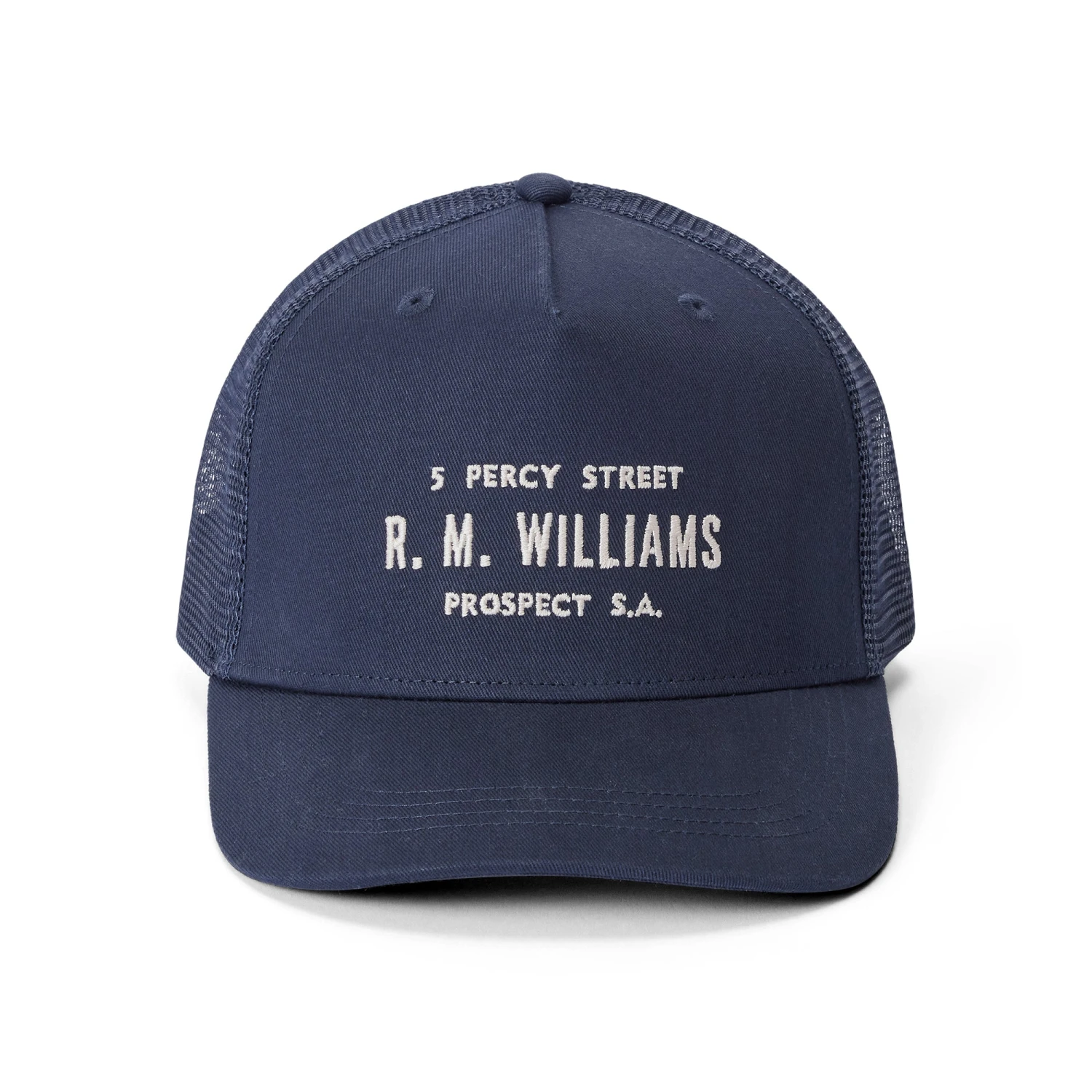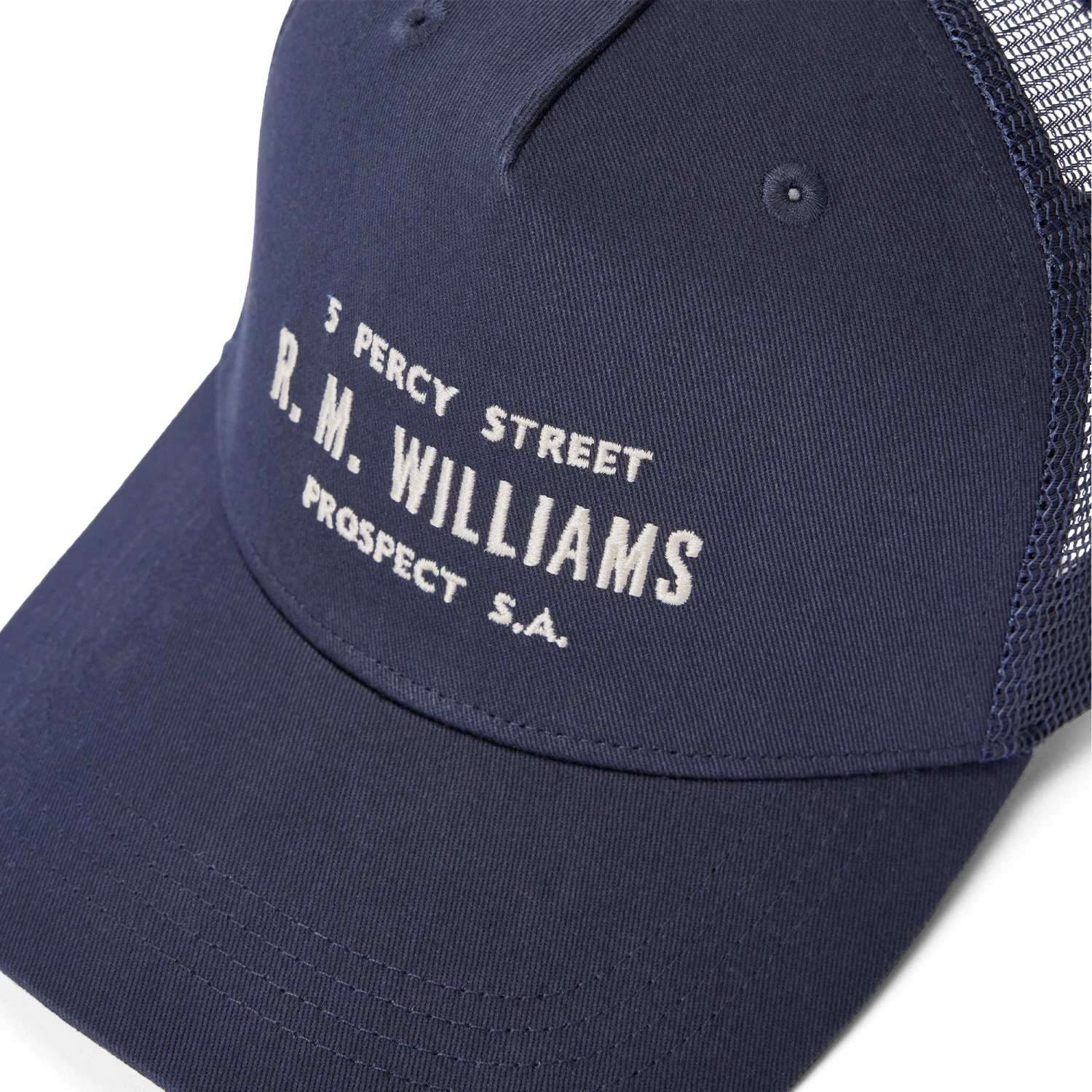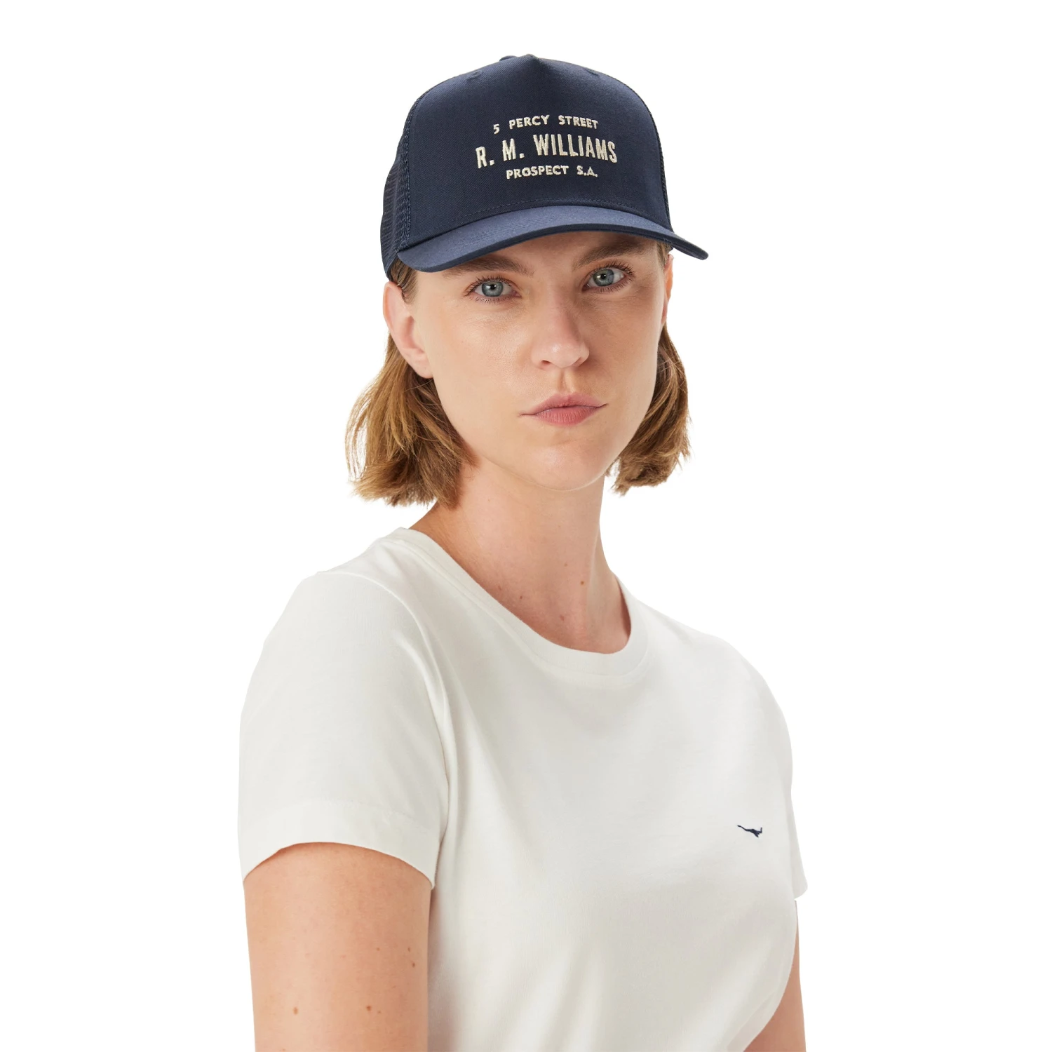 Crafted from organic cotton twill with mesh, this cap features an embroidered R.M.Williams stencil graphic, a snap adjuster for a custom fit, and an elevated, comfortable look.