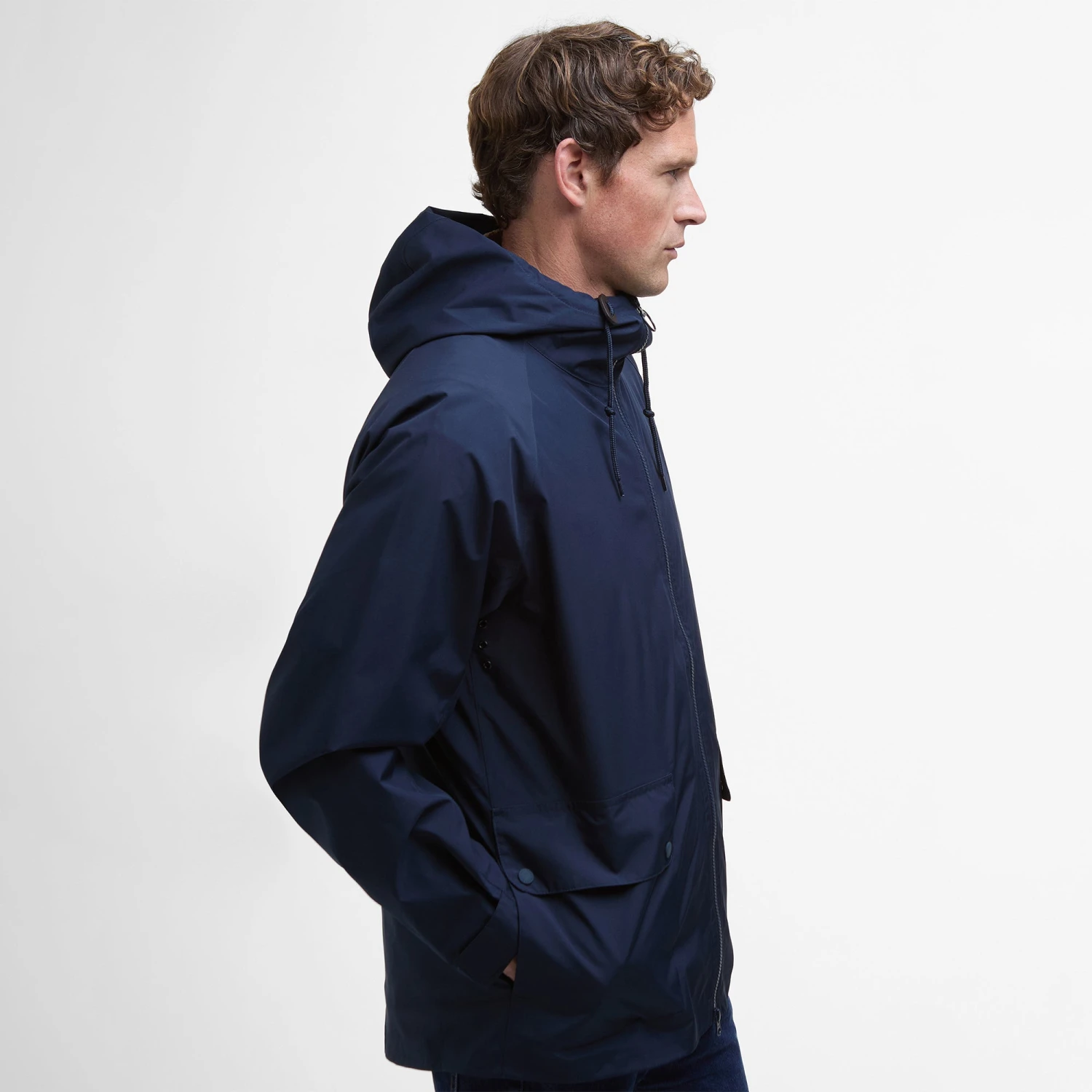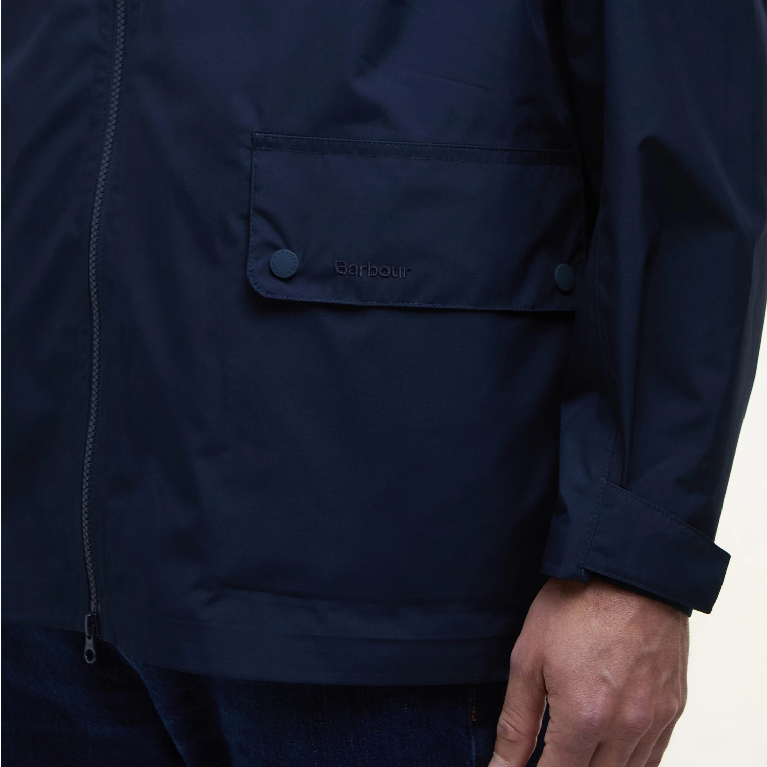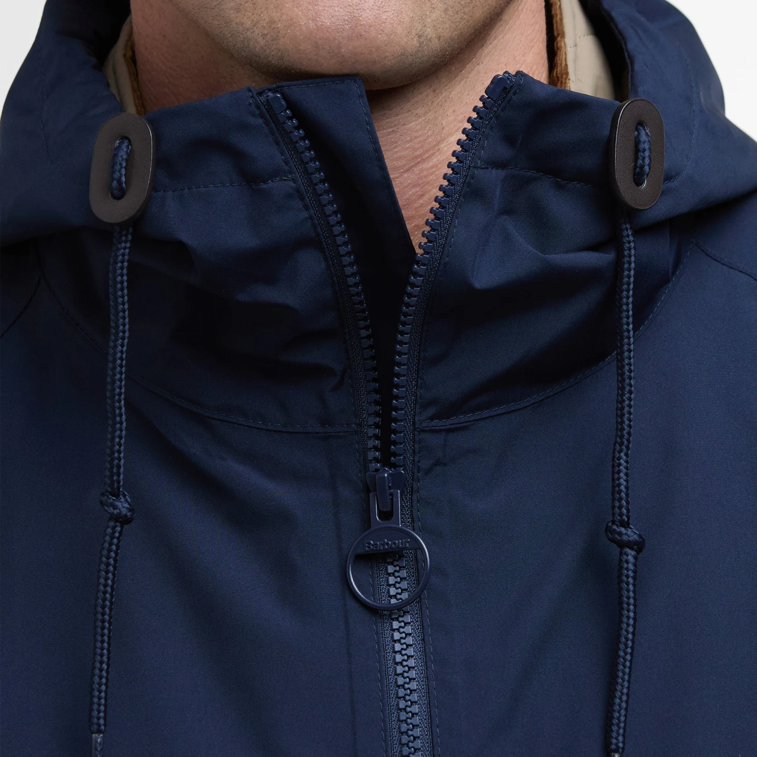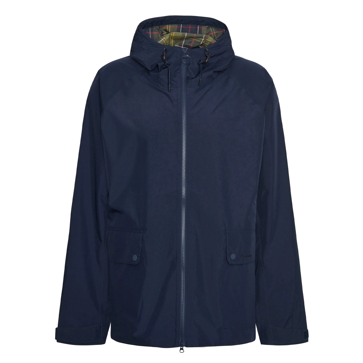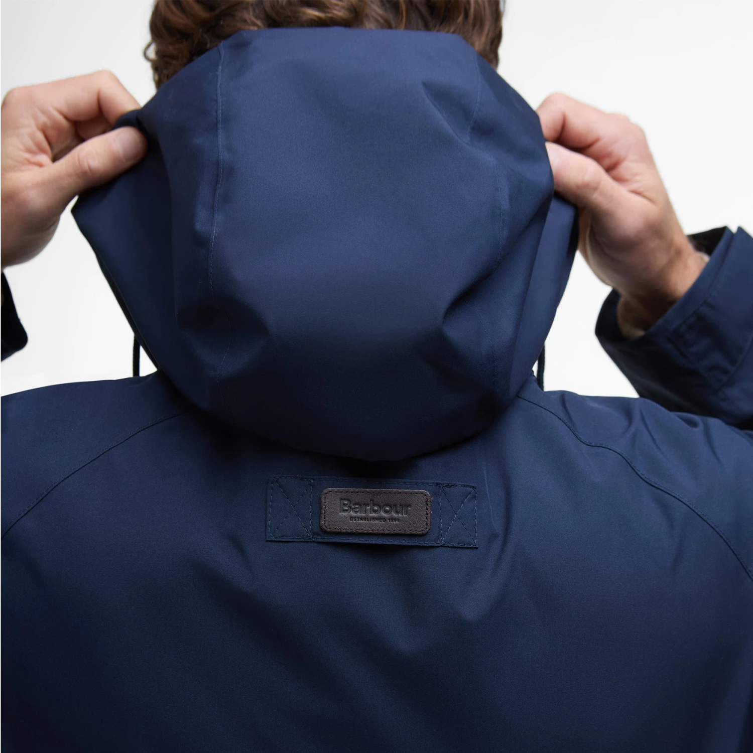 2.5 layer waterproof jacket with adjustable hood and zip front fastening. The style features fully taped seams, dipped hem, lower stud fasten pockets and adjustable cuffs.