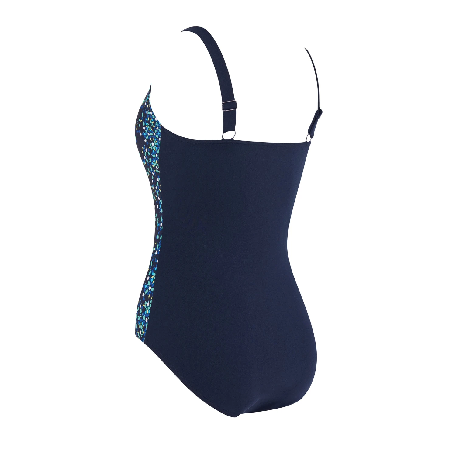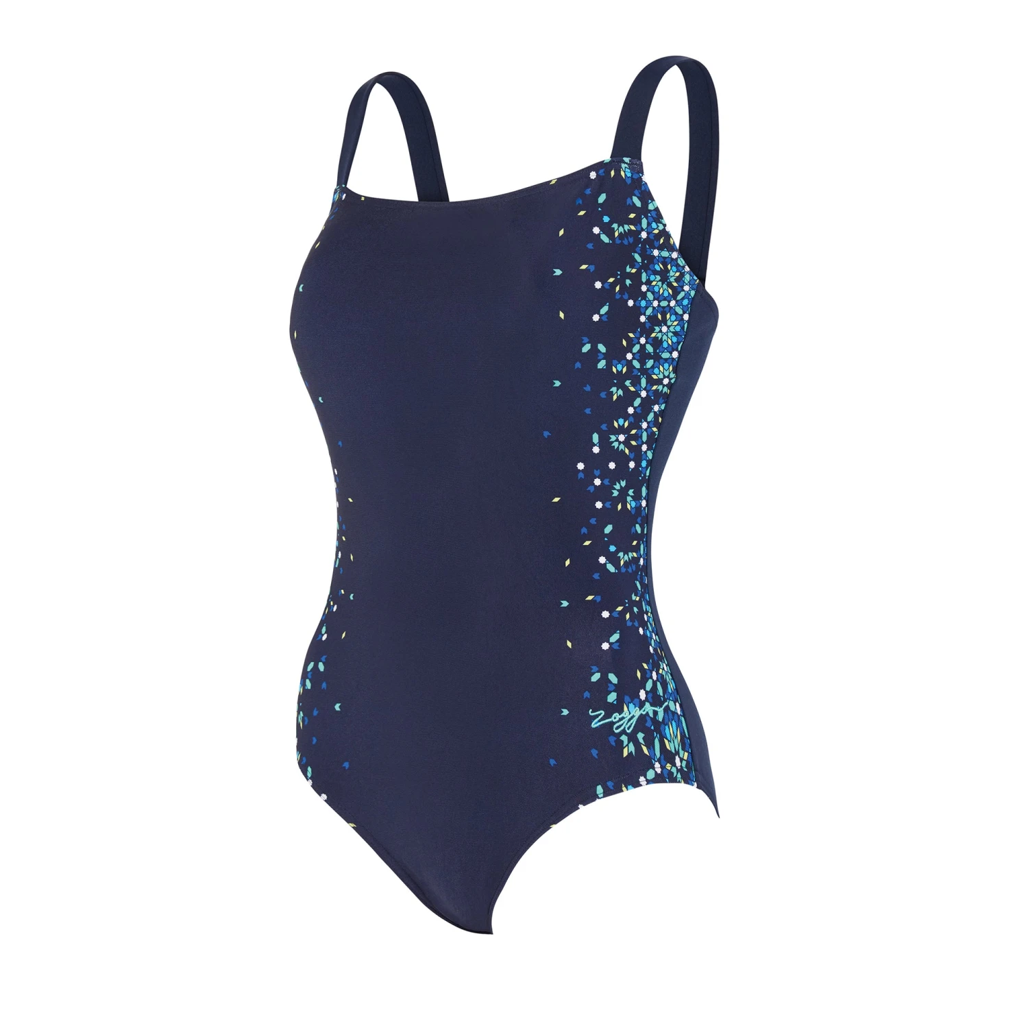 New Blue Chime Adjustable Classic Back swimsuit from Zoggs. The navy print with a subtle side pattern flatters the silhouette, while the full foam cups and front lining provide unparalleled support and coverage. The medium leg height and high classic back offer comfort, and the adjustable straps allow for a customized fit. Whether you’re hitting the beach or the pool, this swimsuit will keep you looking and feeling your best.
