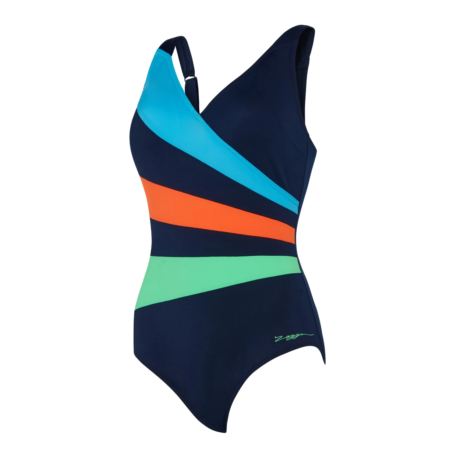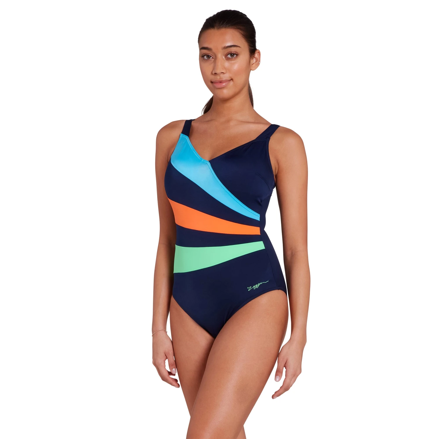Dive into the new season in style and make waves with Zoggs’ Elegance Wrap Panel Crossback Swimsuit. Featuring built-in shelf bra lining for support that goes unnoticed, you won’t have to worry about anything other than enjoying your swim. The crossback design also offers flexibility through the back and shoulders so you won’t have to make any compromises with your stroke. This swimsuit is made from Zoggs’ innovative Ecolastâ„¢ fabric which is produced using recycled plastic waste.