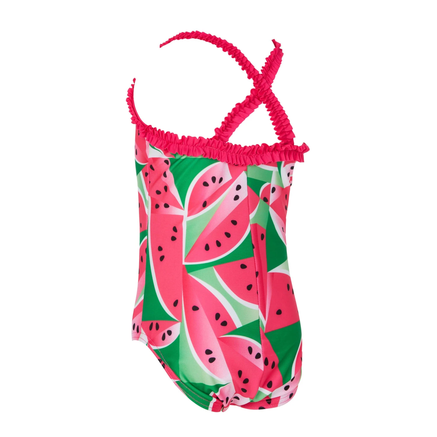 A fun Watermelon swimsuit with ruffles in pink on straps. On a green base with contrasting straps. Made with our Sustainable Eco-fabric Ecolast™, an exclusive yarn made from recycled plastic bottles. Available for girls up to 6 years.